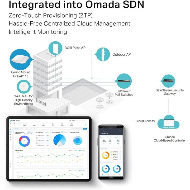 - Integrado en Omada SDN: Zero-Touch Provisioning (ZTP) ?, Administración centralizada de la nube y Monitorización inteligente.