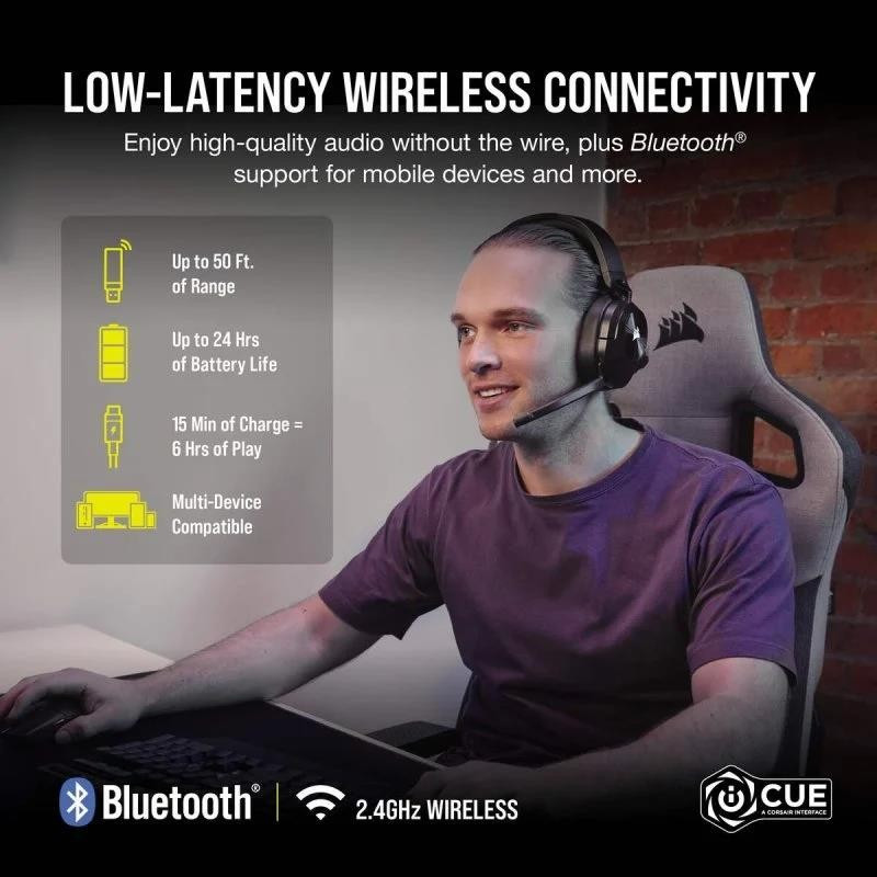 Los auriculares para juegos CORSAIR HS55 WIRELESS combinan audio inalámbrico de baja latencia a 2,4 GHz, Bluetooth y sonido envolvente Dolby Audio 7.1 inalámbrico de 2,4 GHz en PC y Mac, compatible también con PS5 y PS4 incluyendo compatibilidad con Tempest 3D Audio en PS5.
