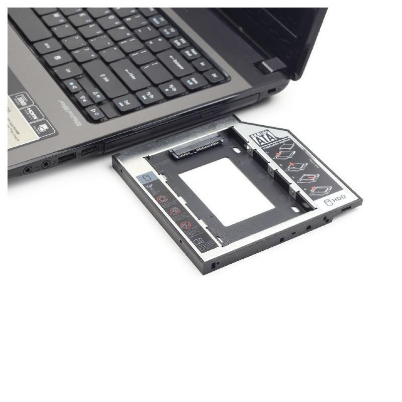 - Este marco de montaje delgada práctica se puede instalar en una delgada 5.25" ranura SATA libre en su PC o portátil delgado . Se puede instalar en lugar de la unidad de DVD - ROM. Esto le permite utilizar un disco duro SATA extra de 2.5".