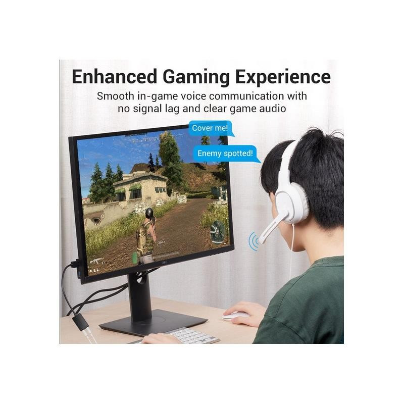 Adaptador portátil y ligero con calidad de sonido clara, reducción de ruido y compatibilidad extensa, ideal para laptops con un solo puerto.