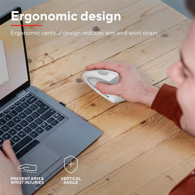 - Totalmente natural: La forma ergonómica del ratón inalámbrico Verto coloca el brazo y la muñeca en una posición natural de 60 grados, por lo que se reduce la tensión del brazo y la muñeca . Esto significa que podrá trabajar con mayor comodidad y aumentar la productividad.