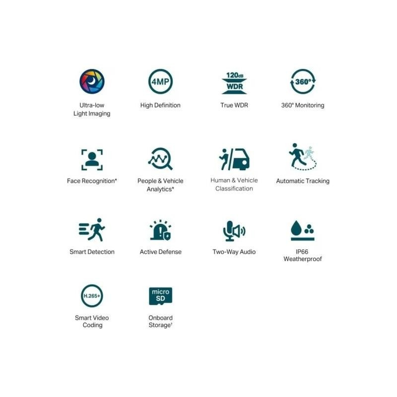 Cámara de red de visión nocturna TP-link Vigi C540S 4mm a todo color de 4 MP para exteriores de 360 grados, captura video colorido y de alta calidad de 4 MP de 24 horas incluso en condiciones de luz ultra baja sin luces suplementarias. Encuentra rápidamente personas y vehículos de interés utilizando una serie de atributos, lo que te permite mejorar la eficiencia de búsqueda. Distingue a humanos y vehículos de otros objetos, por lo que recibirás notificaciones de eventos más precisas. Detecta activamente eventos anormales como intrusión de área y cruce de líneas, enviándote notificaciones al instante.